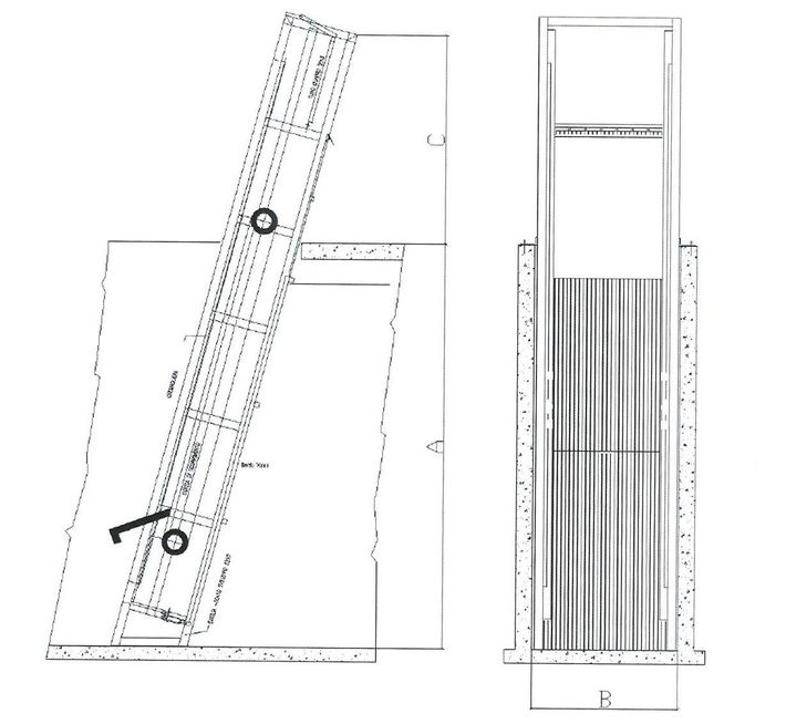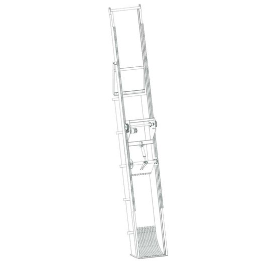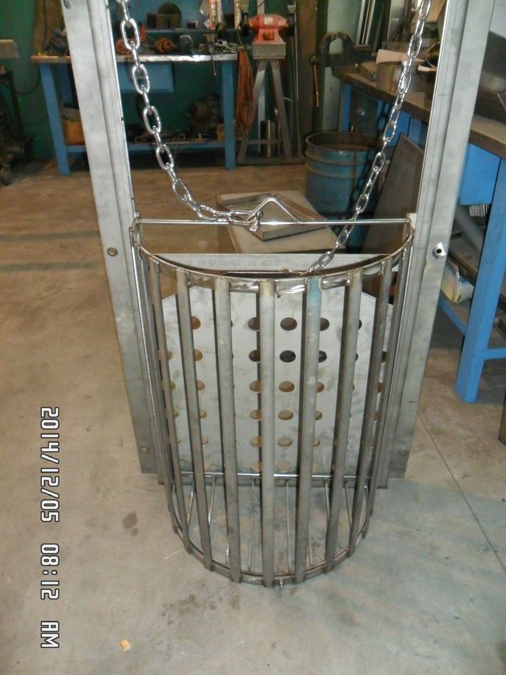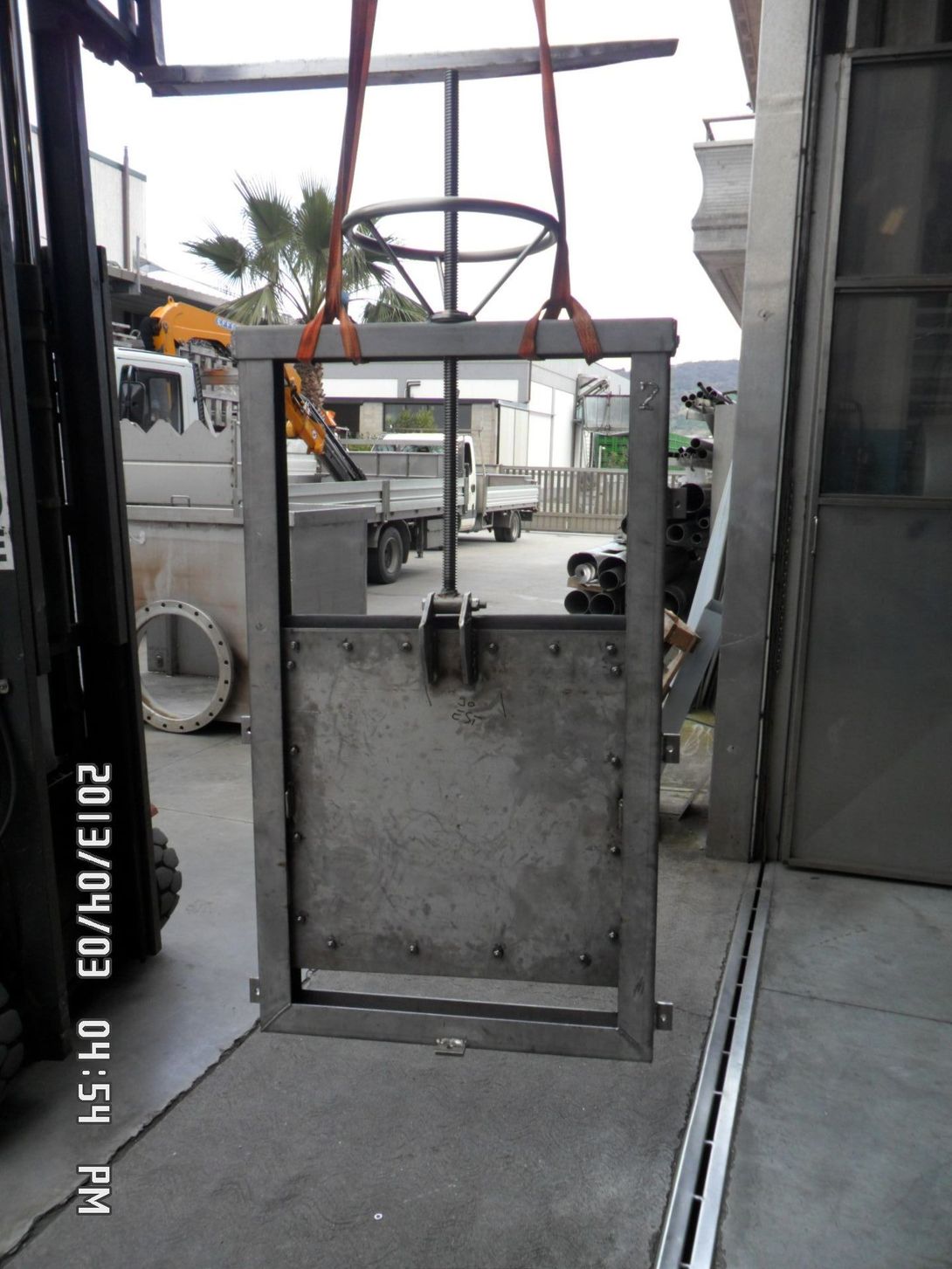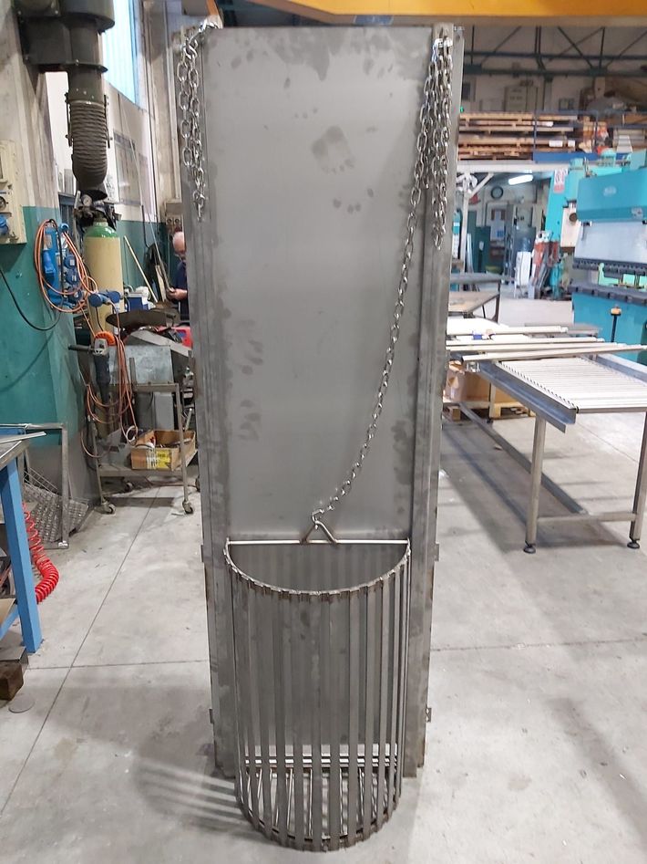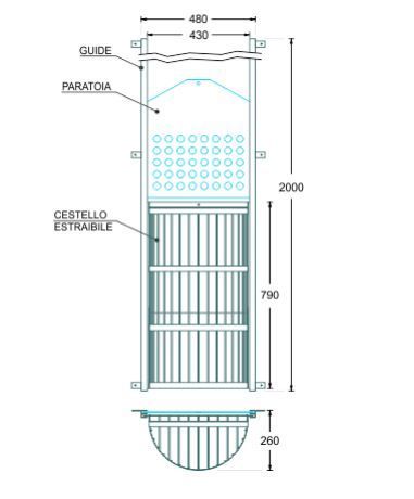 Griglia a cestello per acque di rifiuto urbane o industriali contenenti corpi grossolani, realizzata in acciaio al carbonio zincata a caldo o in acciaio Inox AISI 304 O 316 L. La griglia cestello estraibile e paratoia con fori di drenaggio, fornita con 2 m di guide e catena per il sollevamento separato del cestello e della paratoia, staffe e tasselli di ancoraggio a parete. Tubo condotta max 400 mm.