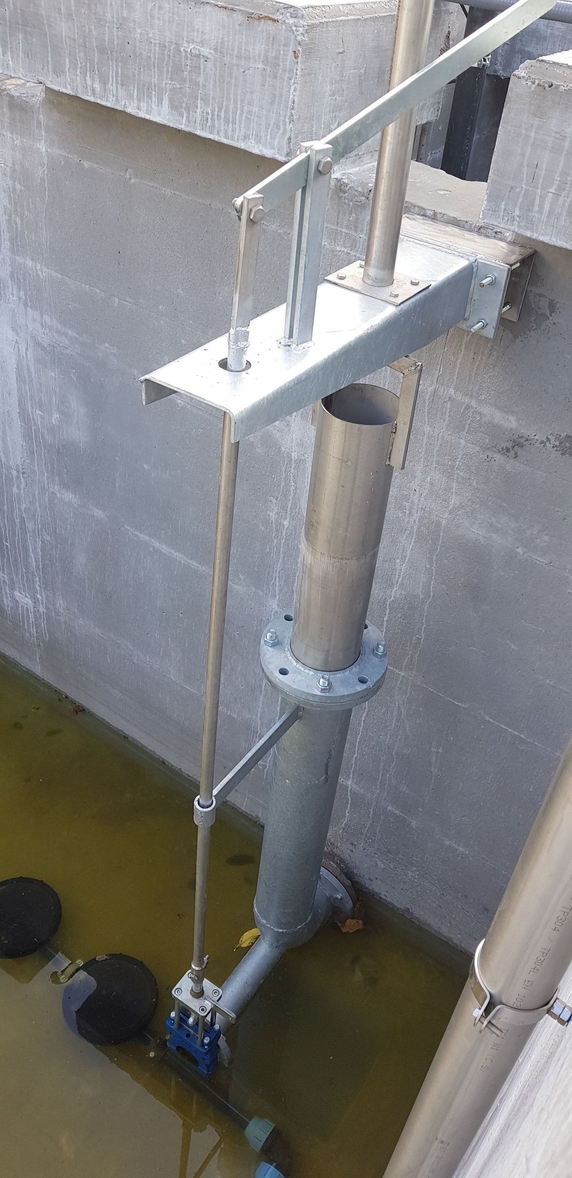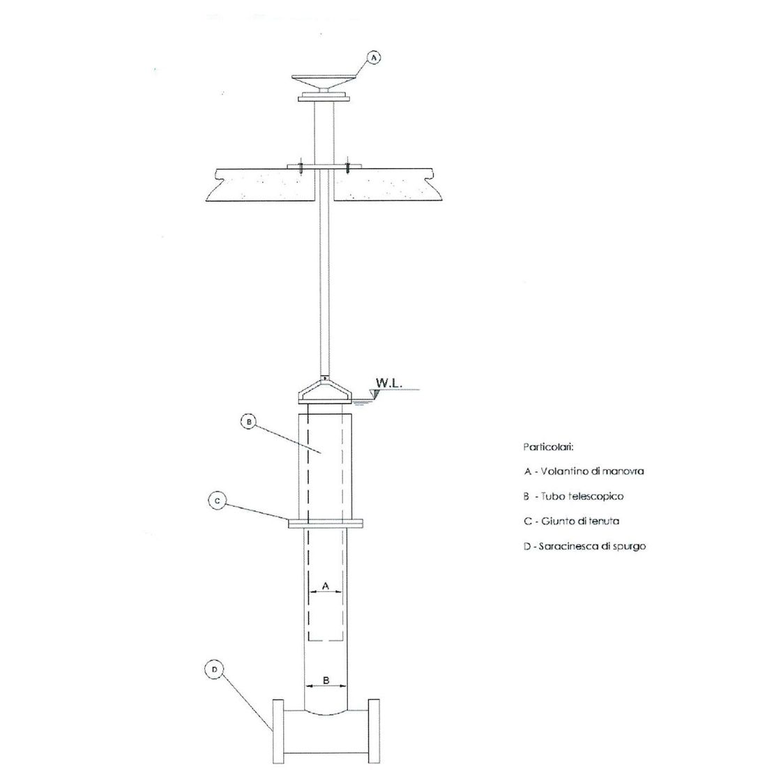 La Valvola Telescopica è utilizzata in vasche in cui è presente lo sfioro di liquidi dalla superficie. L'apparecchiatura è costituita essenzialmente da un doppio tubo telescopico, da una tramoggia di raccolta, da un paraspruzzi, da un'asta di manovra e da un volantino manuale eventualmente sostituibile con attuatore elettrico se richiesta l'automazione del movimento.